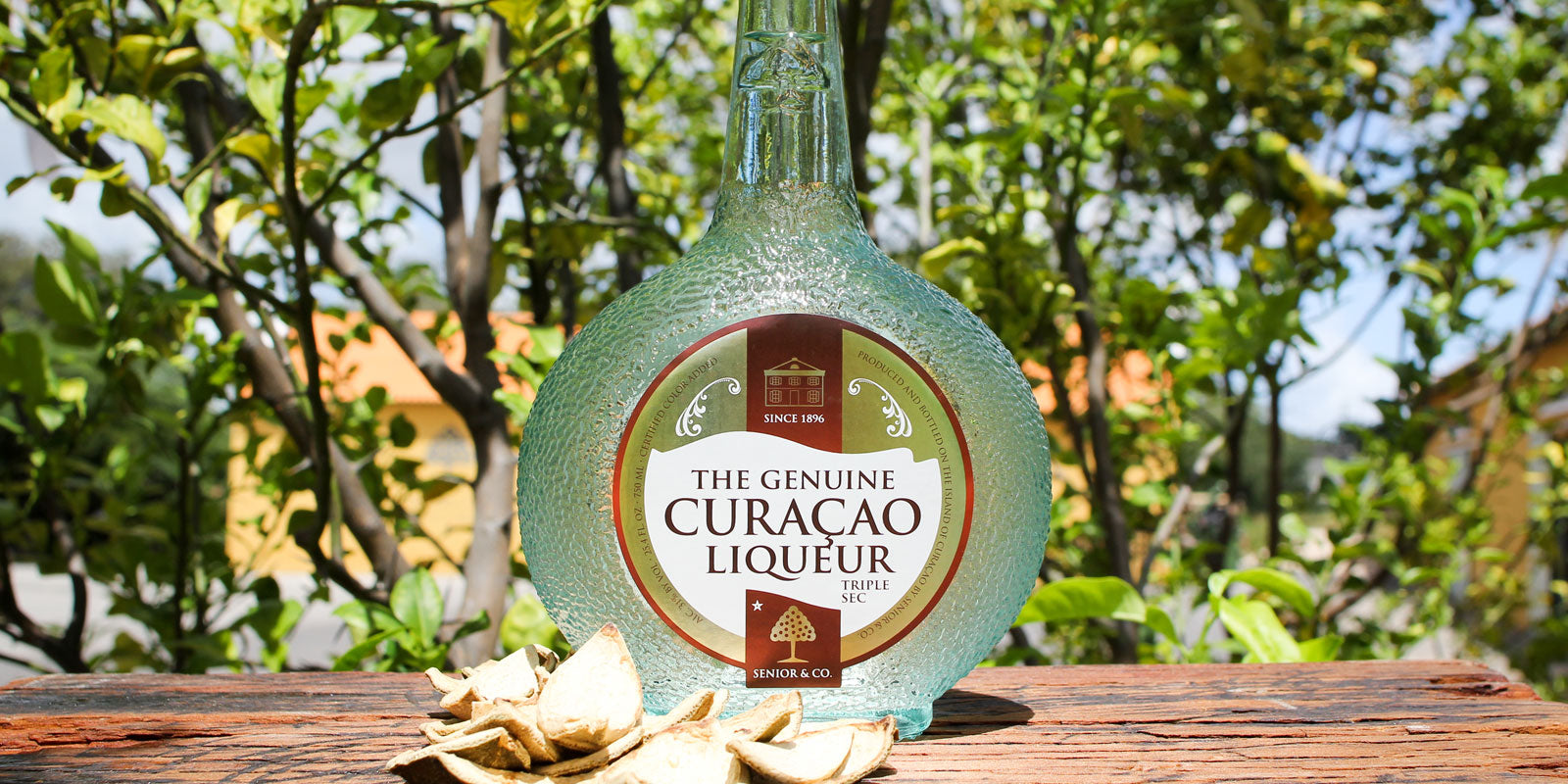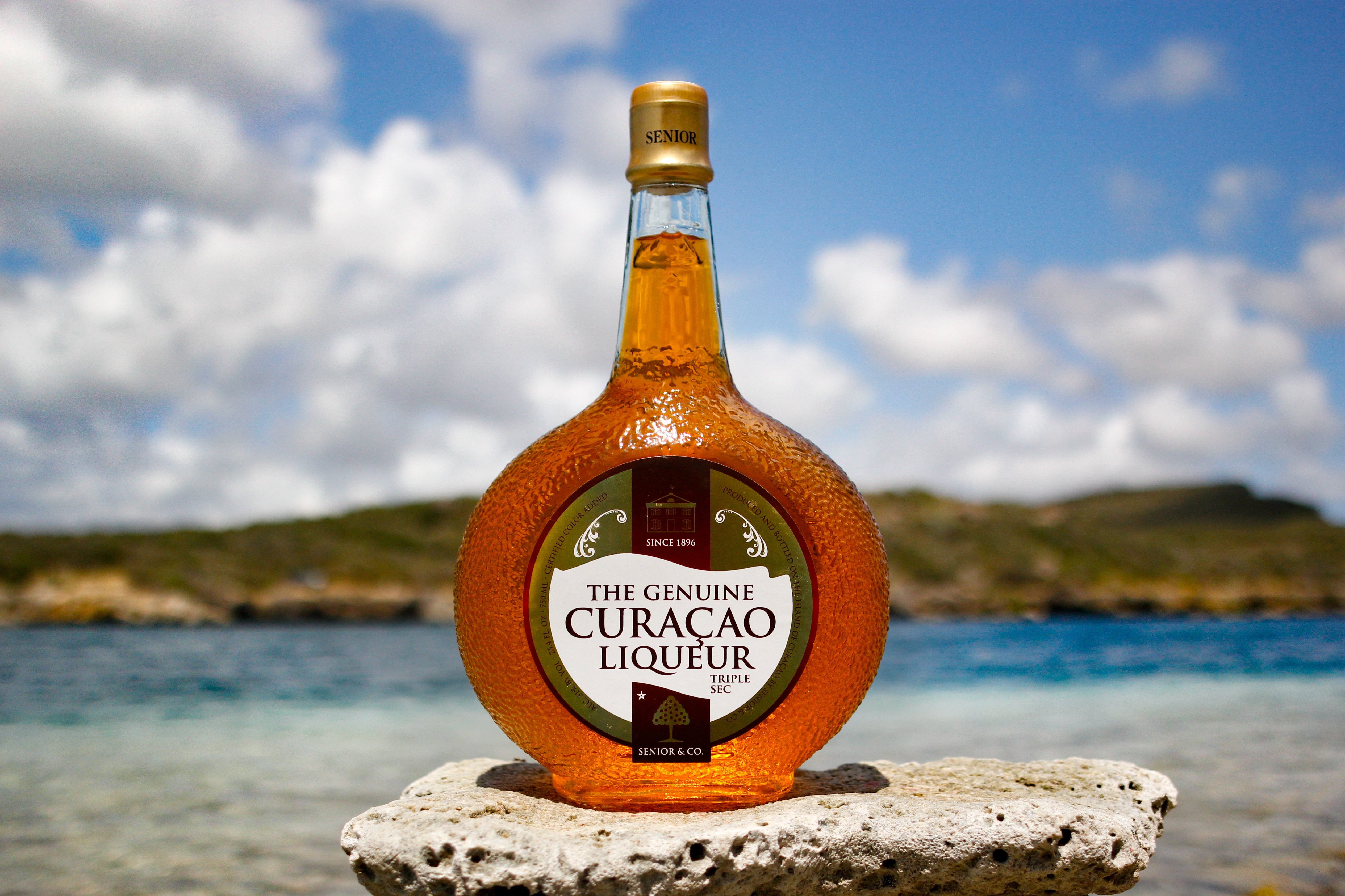 De originele Curacao Likeur draagt het merk Senior&Co en heeft de unieke ronde fles